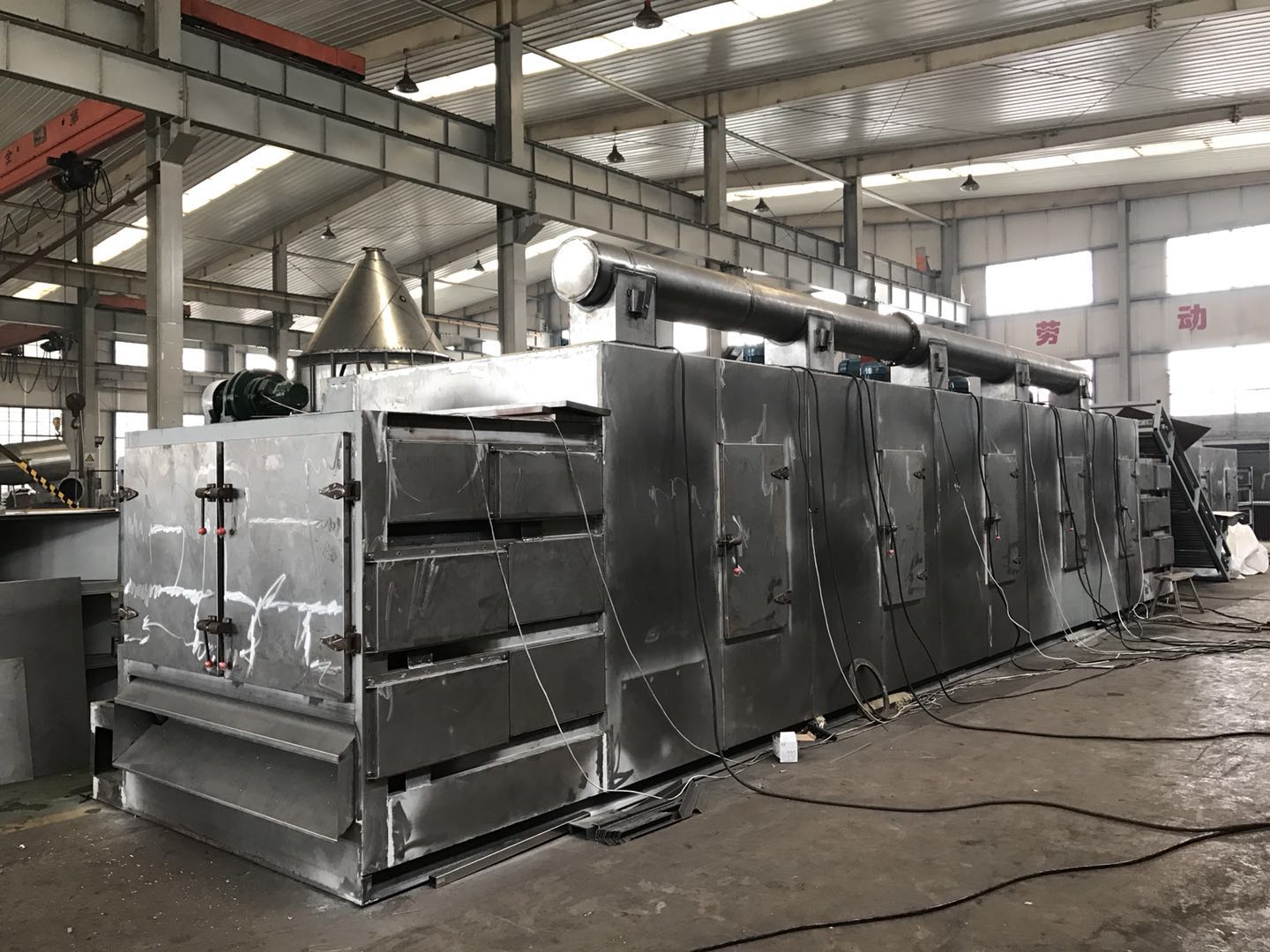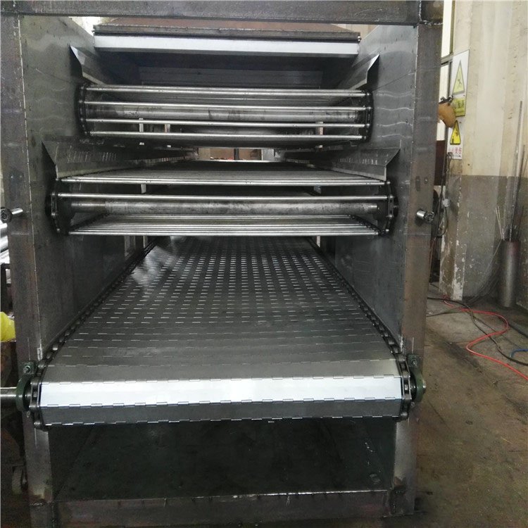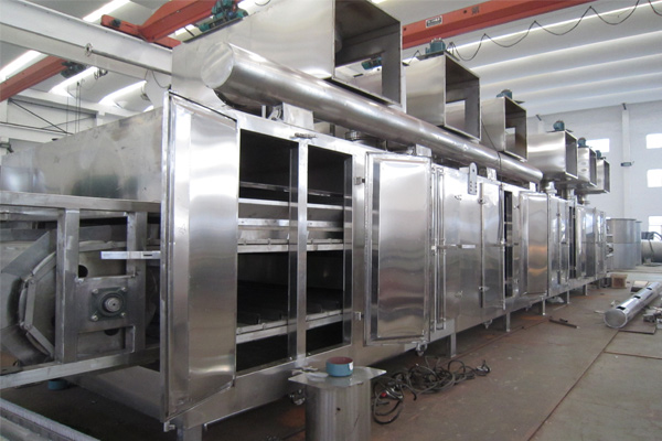 物料由加料器均勻地鋪在網帶上,網帶一般采用12-60目不銹鋼絲網,由傳動裝置拖動在干燥機內移動。干燥機由若干單元組成,每一單元熱風獨立循環,部分尾氣由專門排濕風機排出,廢氣由調節閥控制,熱氣由下往上或由上往下穿過鋪滿物料的網帶完成熱量與質量傳遞的進程,帶走物料水份。網帶緩慢移動,運行速度可根據物料溫度自由調節,干燥后的成品連續落入收料器中。上下循環單元根據用戶需要可靈活配備,單元數量亦可根據需要選取。