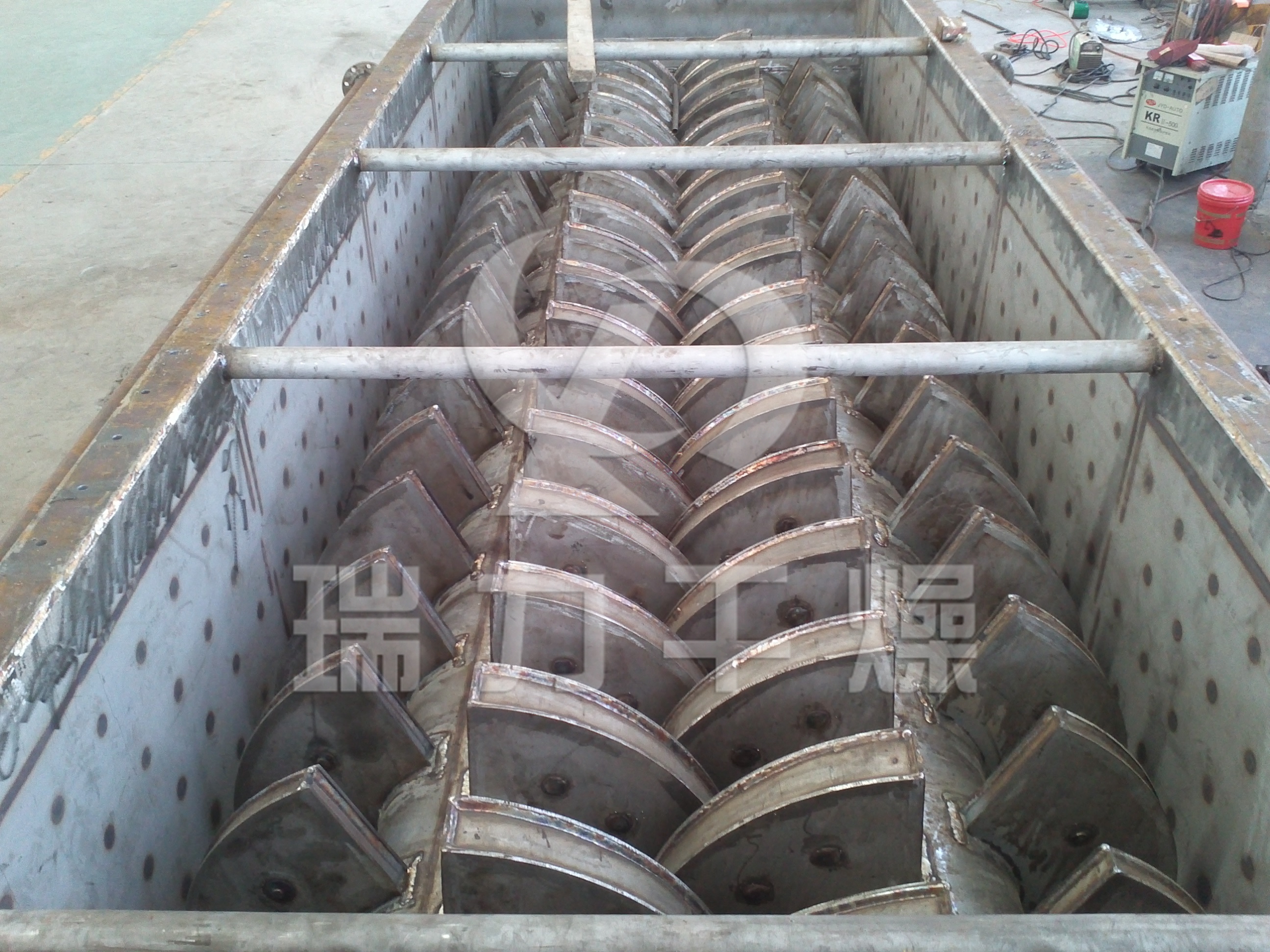 漿葉干燥機已成功地用于食品、化工、石化、染料、工業污泥等領域。設備傳熱、冷卻、攪拌的特性使之可以完成以下單元操作:燃燒(低溫)、冷卻、干燥(溶劑回收)加熱(融化)、反應和滅菌。攪拌漿葉同時又是傳熱面,使單位有效容積內傳熱面積增大,縮短了處理時間。楔型漿葉傳熱面又具有自清潔功能。壓縮--膨脹攪拌功能使物料混和均勻。物料沿軸向成'活塞流'運動,在軸向區間內,物料的溫度、濕度、混合度梯度很小。用導熱油做熱介質漿葉干燥機可完成低溫燃燒工作。如:二水硫酸鈣(Ca2SO4·2H2O) 燃燒轉化為半水硫酸鈣(Ca2SO4·1/22H2O)。碳酸氫鈉(NaHCO3)經煅燒轉化為純堿(Na2HCO3)等。通入冷卻介質,如水、冷卻鹽水等即可用來冷卻。如:使用于純堿行業的漿葉式涼堿機,取代老式的空氣冷卻涼堿機,節省了能源及尾氣處理設備,降低了操作費用。干燥,設備最主要的功能,不使用熱空氣,使溶劑回收、能源消耗、環境控制處于易處理的理想狀態。對需回收溶劑、易燃易氧化熱敏性物料尤為適應。已廣泛用于精細化工、石化、染料行業。軸向區間內,溫度、濕度、混合度的均勻性,使得設備可用來加熱或融化,或進行一些固體物料反應。在復合肥及變性淀粉行業均已成功使用。漿葉干燥機可用來對食物和面粉進行滅菌處理。單位有效容積內大的加熱面積,很快就將物料加熱到滅菌溫度,避免了長時間加熱而改變物料品質。安裝結構示意圖技術規格